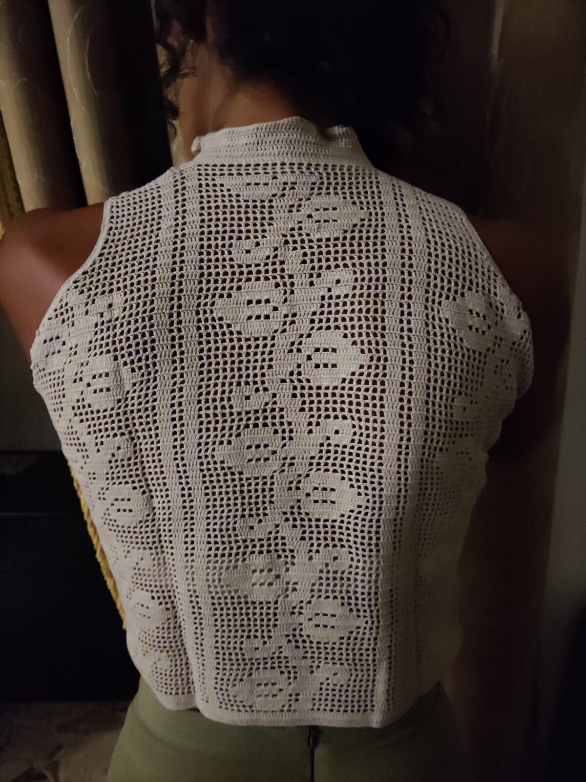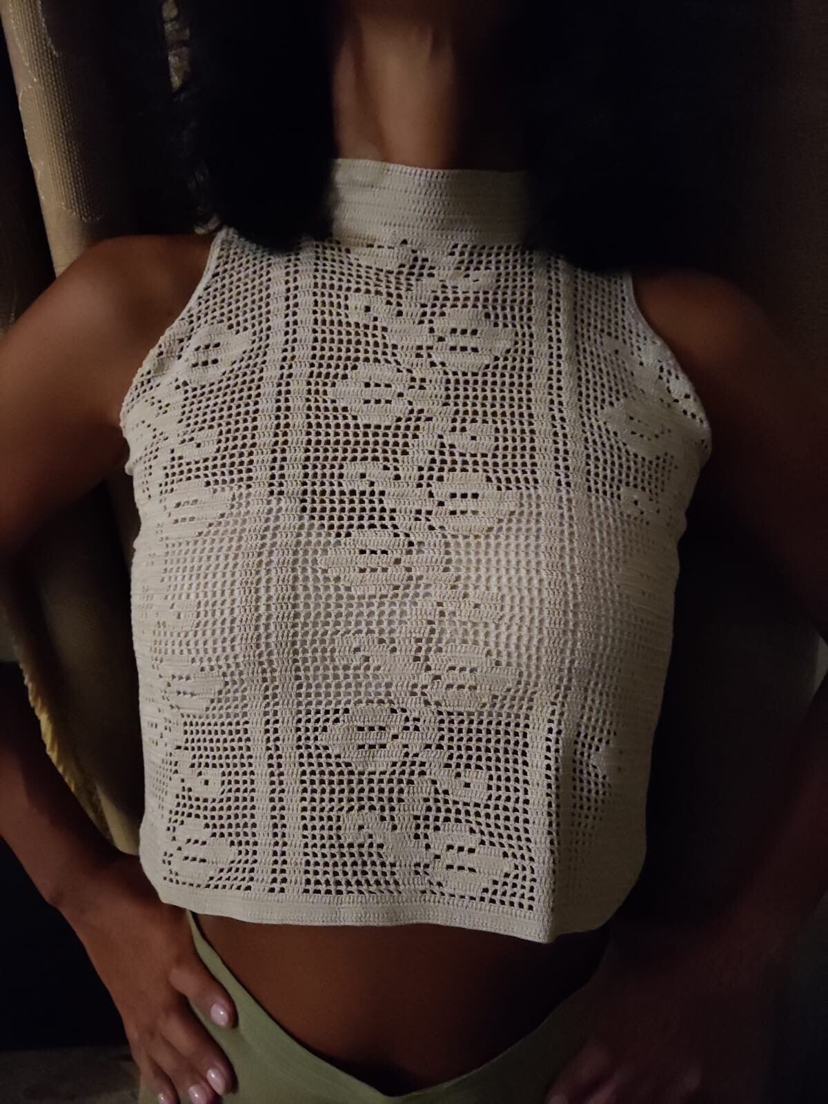 Top a collo alto realizzato interamente a mano, collo alto e bottoni sulla spalla destra.